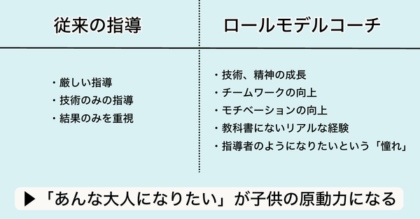 昨今、教育やスポーツの現場でロールモデルコーチという存在が注目されています。日本サッカー代表チームも取り入れている新しいアプローチで、技術のレベルアップはもちろん、精神的な面でのアドバイス、モチベーションの向上、チーム力の強化にも大きな影響を与える存在です。しかしこれらが必要なのは、プロアスリートだけではないはずです。