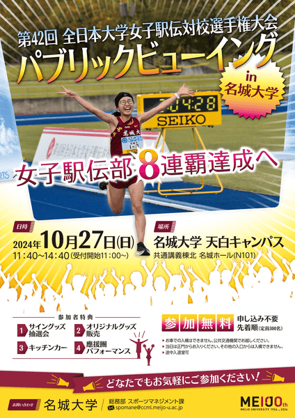 本学女子駅伝部が史上初の8連覇をかけて戦う「第42回全日本大学女子駅伝対校選手権大会」のパブリックビューイングを大会当日の10月27日、名城大学天白キャンパスで開催します。