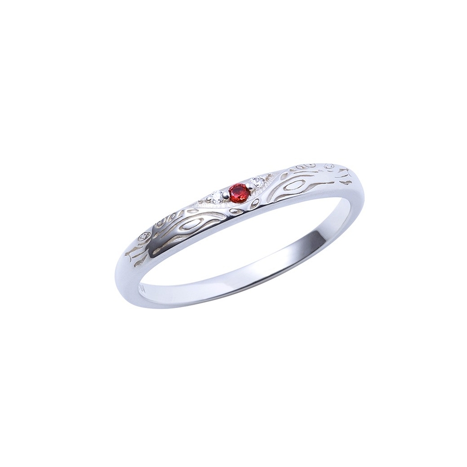 リング表面には印象的な“ドロドロ”をイメージした柄をモチーフとして取り込み、赤いカラーストーンをセット。リング内側には名前の刻印を施しました。