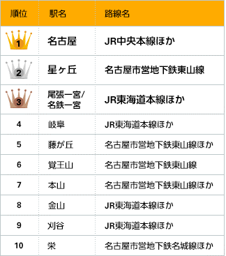 「借りて住みたい街」のNo.1も「名古屋」が獲得し、「買って住みたい街」とあわせて2冠を達成しました。「買って住みたい街」では8位で、名古屋副都心として事業集積性が高く、5路線が乗り入れるターミナル駅の「金山」が2位に入っています。交通アクセスの良い名古屋市営地下鉄の各駅が上位にランクインしたほか、「岐阜」「尾張一宮/名鉄一宮」など、名古屋近郊のベッドタウンも上位にランクインしています。