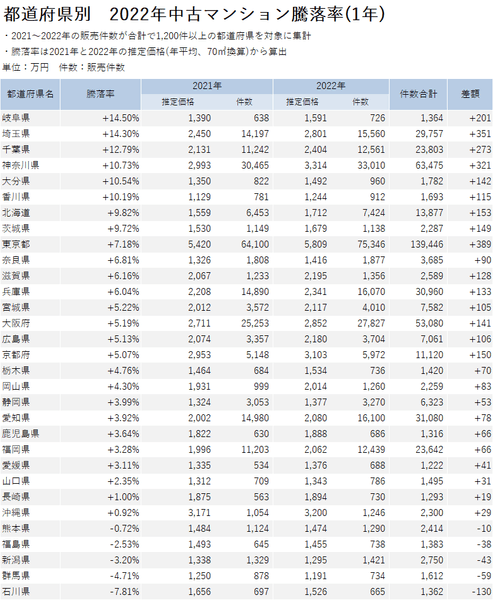 • 騰落率トップは、「岐阜県」の+14.50%。70㎡換算の推定価格は約200万円上昇した。次いで「埼玉県」、「千葉県」、「神奈川県」と首都圏が続いた。