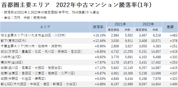 • 騰落率トップは、「埼玉主要エリア(さいたま市全10区・川口市)」の+16.19%。前年と比較し、70㎡換算の推定価格は約480万円上昇した。次いで「都下(東京23区外)」、「千葉主要エリア(市川市・船橋市・浦安市)」。
