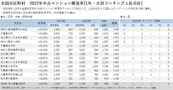 その第2弾として、2022年の中古マンション騰落率ランキング上位に複数回ランクインした市区について、2021年と比較した1年での騰落率を調査。また、毎月相場推移を発表している都道府県および首都圏主要エリアにおける騰落率についても、1年を通したデータでの調査を行いましたので発表いたします。