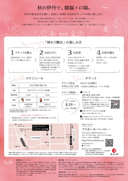 街なかで舞台芸術を楽しむ、アイホールの「たみ・まちなか劇場」シリーズ。平成30年度から始まった「味わう舞台」は5回目の開催となります。