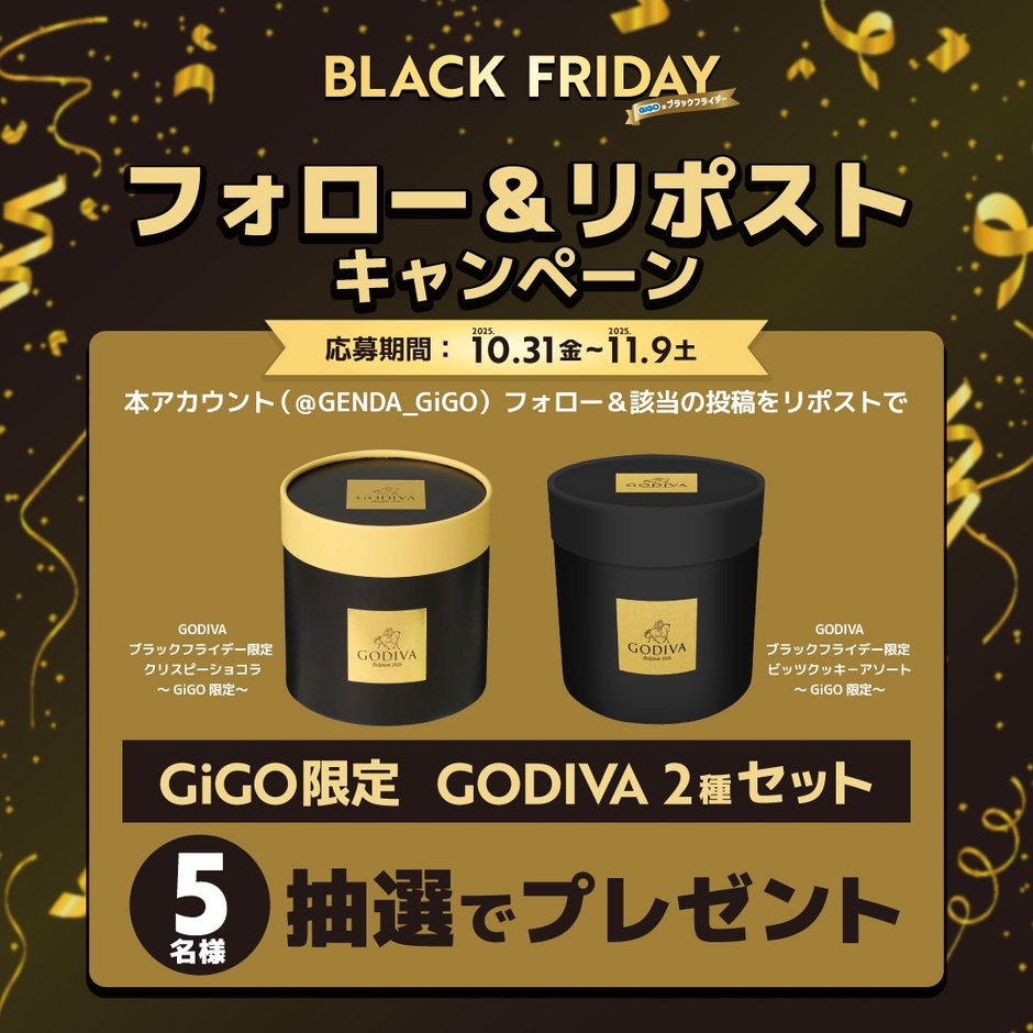 対象のアカウントをフォローし、該当ポストをリポストしていただいた方の中から抽選で5名様に、11月1日(土)より登場予定の「GiGO限定 GODIVA ブラックフライデープライズ2種セット」をプレゼントいたします。