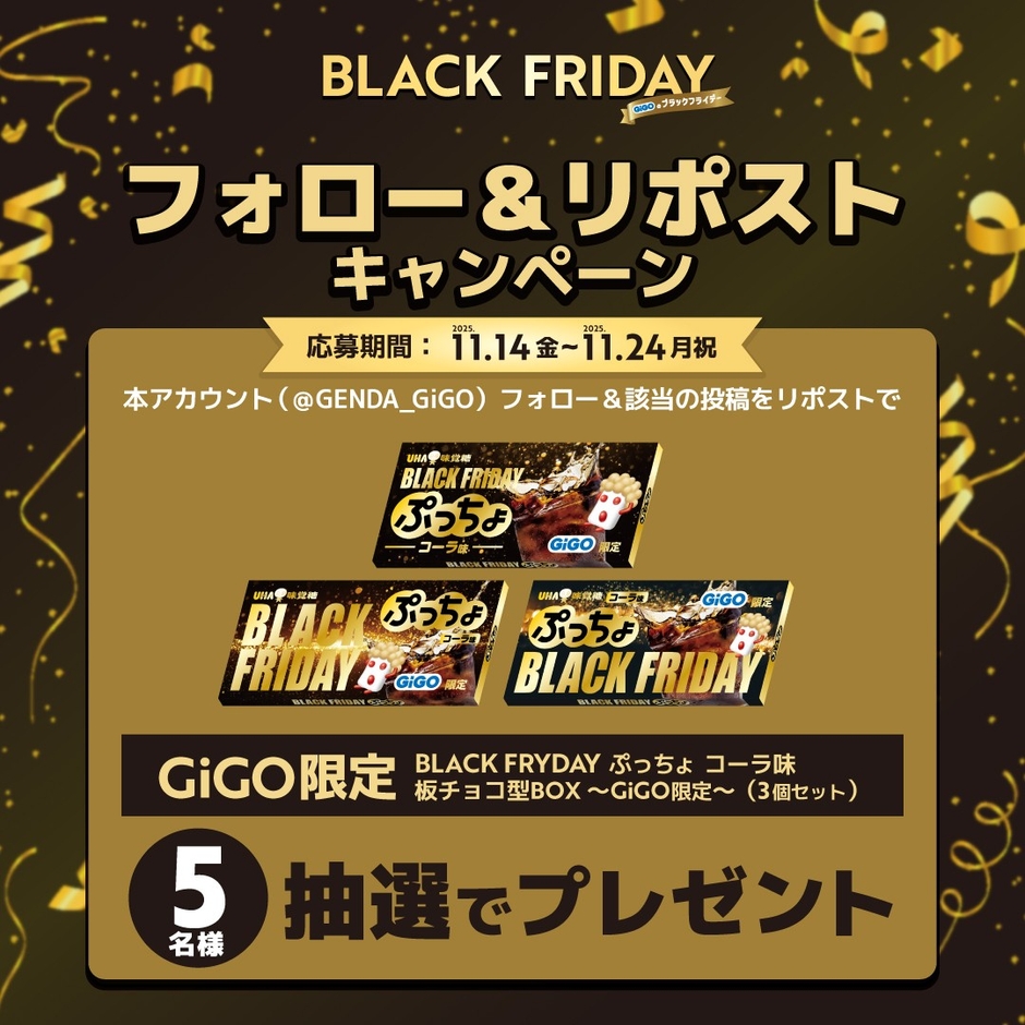 対象のアカウントをフォローし、該当ポストをリポストしていただいた方の中から抽選で5名様に、11月15日(土)より登場予定の「UHA味覚糖 BLACK FRIDAY ぷっちょ コーラ味 板チョコ型BOX 3個セット」をプレゼントいたします。