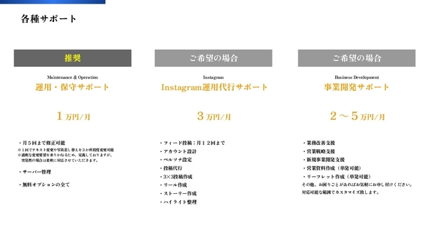 ○インスタグラム運用代行サポート:3万円/月