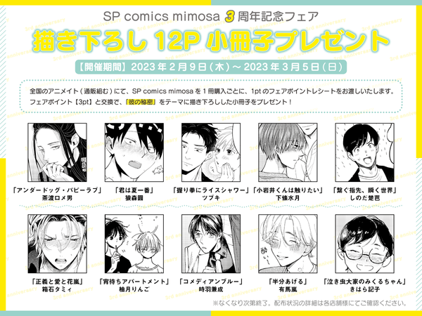 SP comics mimosa3周年を記念して、2/9(木)よりアニメイト全店で3周年小冊子プレゼントフェアを開催します。