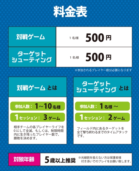 赤外線レーザーガンを利用したシューティングなので、けがや痛みの心配がなく、安心・安全にゲームを楽しむことができます。