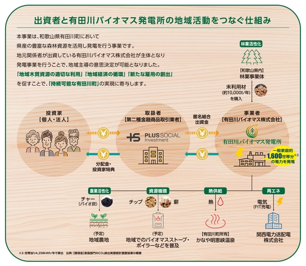 プラスソーシャルインベストメント株式会社(代表取締役社長 野池雅人、京都市上京区、以下PSI)は、有田川バイオマス株式会社(代表取締役 原見健也、和歌山県有田川町)を営業者とする「有田川町木質バイオマス発電事業B号匿名組合(愛称:【有田川町】地域資源循環型「木質バイオマス発電ファンド」)」募集総額500万円(1口金額2万円、会計期間3年)を組成し、2022年10月12日に投資型クラウドファンディングの手法を用いた、社会的投資プラットフォーム「en.tryエントライ」(以下エントライ)で募集を開始しました。
