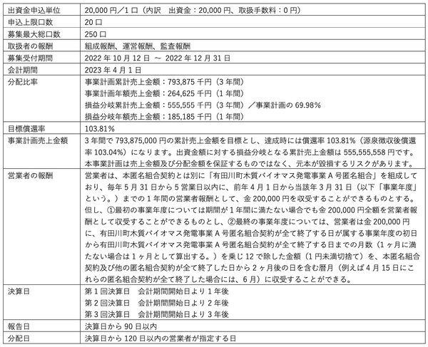 有田川町木質バイオマス発電事業B号匿名組合の概要
