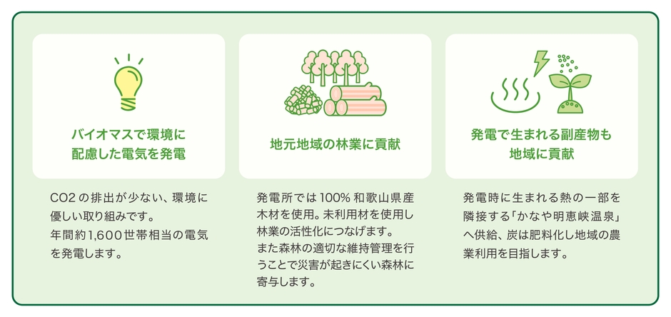 本発電所は、100%和歌山県産未利用材を活用することで有田川町の再生可能エネルギー導入促進に寄与し、林業の活性化だけではなく発電時に生まれる副産物を地域資源として再利用することで、地域経済の発展・循環など多くのメリットをもたらす地域貢献型の木質バイオマス発電所をめざします。