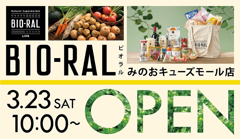 2016年に1号店となる「ビオラル靭店」のオープン以降、高まる健康志向や安全・安心へのニーズにお応えするため、各店舗への自社ブランド「BIO-RAL」商品の販売も拡大しています。さらに多くのお客様に「ビオラル」をお楽しみいただくため、3月は近畿圏・首都圏ともに新店舗を出店予定で、3月23日(土)に「ビオラルみのおキューズモール店」、3月27日(水)に「ビオラル国立駅前店」(東京都国立市)をオープンいたします。