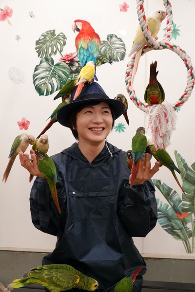 “鳥のいるカフェ 千駄木店”にはインコ・オウムをはじめとした世界中の珍しい鳥類が常時100羽以上いるという鳥好きにはたまらない新感覚のふれあいショップ。ハットをかぶり鳥と対面した竹島の頭には、見る見るうちに無数の鳥が集まり、自然と竹島の顔にも笑みが溢れた。途中、竹島が手にした餌のトウモロコシを鳥たちが奪い合い争うハプニングも。