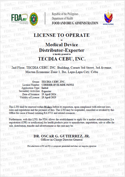 テクダイヤ株式会社(本社:東京都港区、代表取締役:小山真吾、以下当社)の製造工場TECDIA CEBU, INC.(以下セブ工場)は、フィリピンFDA当局(Food and Drug Administration PHILIPPINES)より医療機器販売・輸出業者認証を取得いたしました。