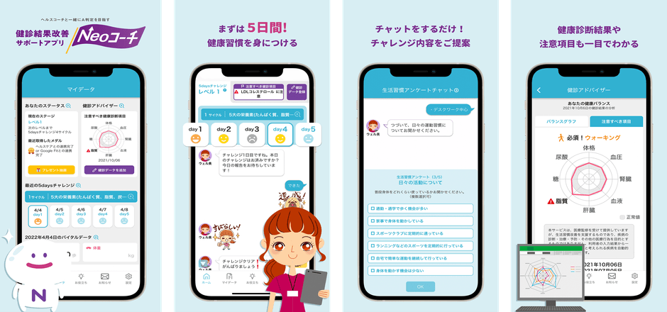 通常ヘルスコーチングは対面で行うものですが、「Neoコーチ」ではバーチャルヘルスコーチの「ウェル美」を介してアプリ上で「いつでも・どこでも・気軽に」ヘルスコーチングを続けられます。具体的には日々のチャレンジの取組みを報告すると、「ウェル美」コーチがチャットで5daysチャレンジにおける日々のチェックと最終日の振り返りを行います。「ウェル美」とチャットで振り返りをしながら取り組んでいくことで楽しくかつ効果を実感しながら生活習慣改善取組みを続けていくことができます。