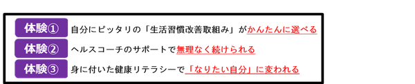 (※)一人ひとりの健康課題に合わせて、「自らの気づき→自主性を高める→行動の継続→習慣化」の行動変容のプロセスに沿って、“無理なく続けられること”を発見して“小さな成功体験”を積み上げることで行動継続へ導くコミュニケーション手法です。