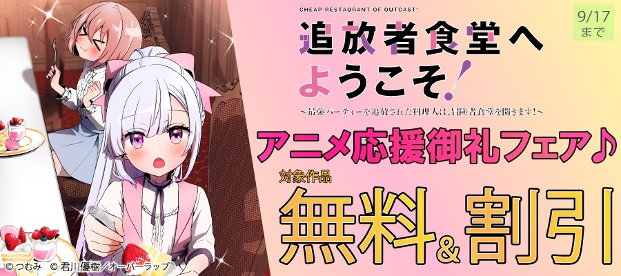 『追放者食堂へようこそ!~最強パーティーを追放された料理人は、冒険者食堂を開きます!~』(漫画:つむみ、原作:君川優樹)ほか対象作品が各巻無料または割引キャンペーンを実施中!