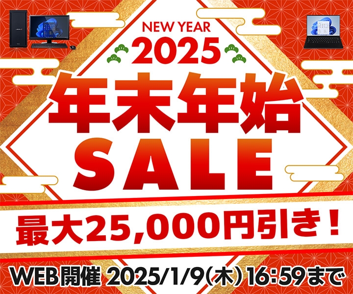 パソコン工房インターネット通販ではただいま1年の感謝の気持ちを込めて『年末年始セール』を2025年1月9日(木)16時59分まで実施中!対象BTOパソコンが最大25,000円引き!