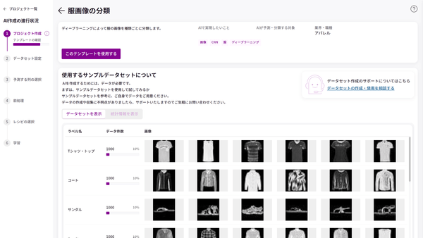 プロジェクトテンプレートは、需要予測や退職者予測など、AIで予測・分類したい対象ごとに用意されており、その中には、AIの作成に必要なレシピやサンプルのデータセットが入っています。