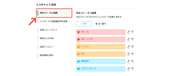 これまで別画面での操作が必要だった対応ステータスの編集が、チャット設定から直接行えるようになりました。