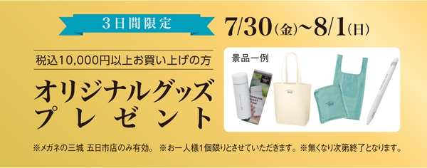 7月30日(金)~8月29日(日)の期間、オープン記念セールを開催いたします。また、7月30日(金)~8月1日(日)の3日間、税込10,000円以上お買い上げいただいた方に「OPEN記念グッズ」をプレゼントいたします。※無くなり次第終了となります。