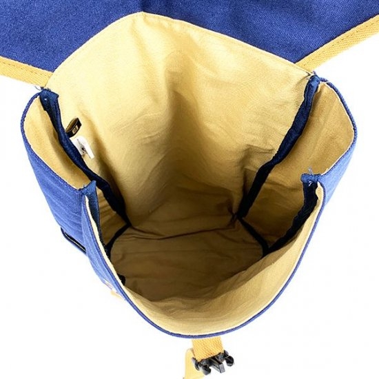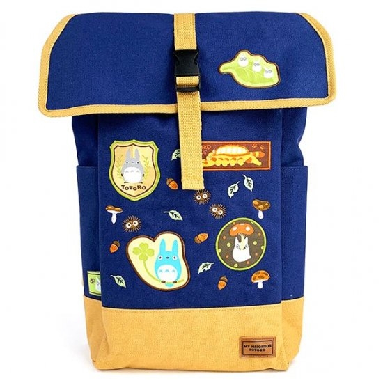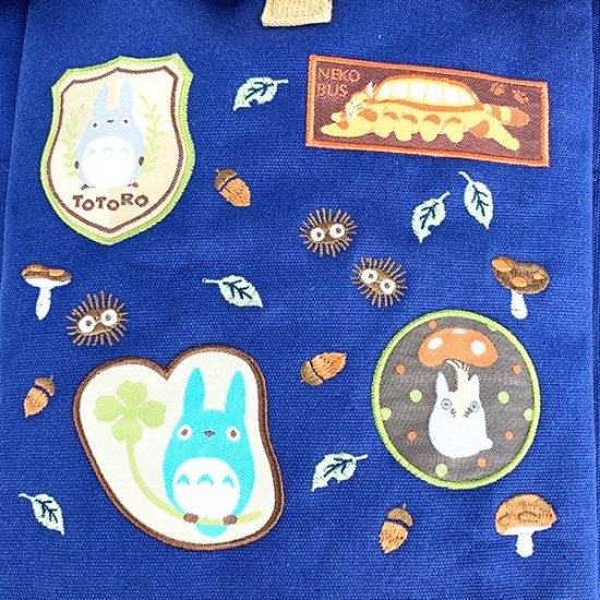 ネイビー×マスタードのリュックに、トトロやねこバスのワッペンが全体にいくつも貼られています♪まっくろくろすけたちの刺繍も散りばめられていて、ナチュラル感のあるデザインですよね。