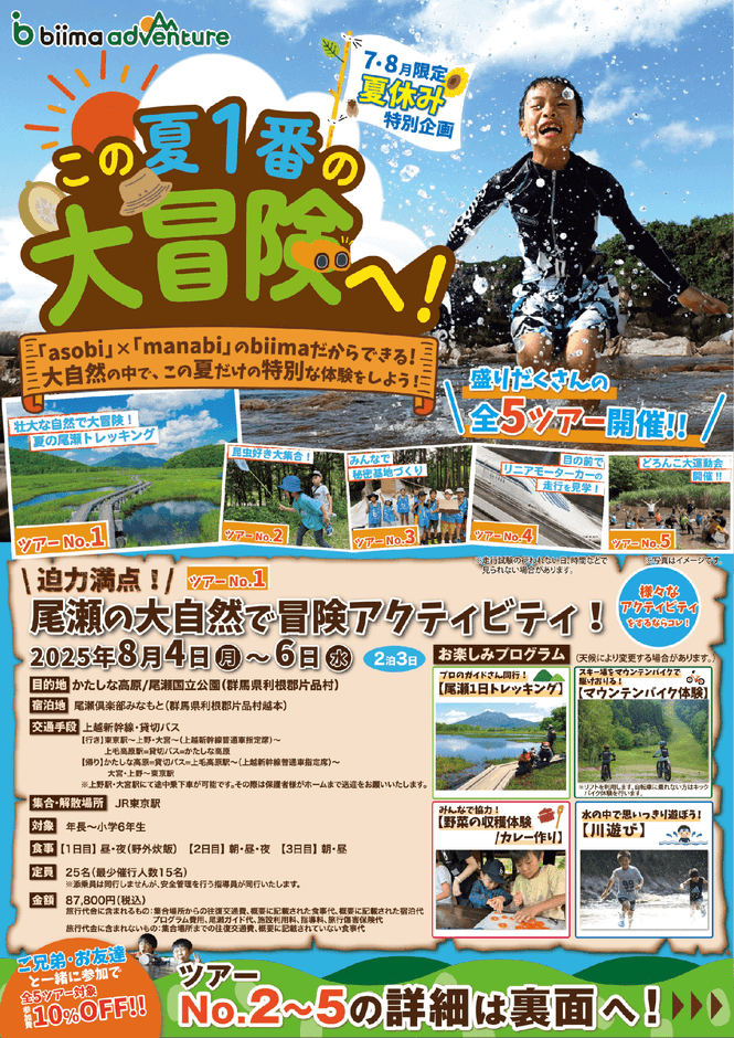 ■7,8月限定の夏休み特別企画 ツアー詳細(https://www.biima-adventure.com/summertour)