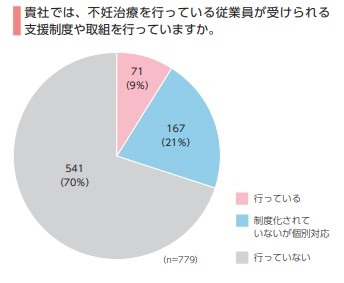 企業として支援制度や取り組みを行っている企業や、制度化されていないが個別対応をしている企業は3割ほどとなっています。まだまだ少ないですが、「くるみんプラス」制度を活用し、支援を実施する企業が増加していくといいですね。