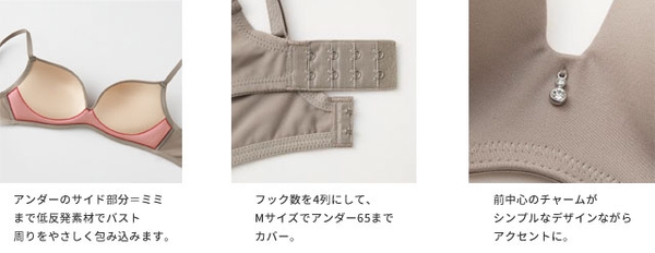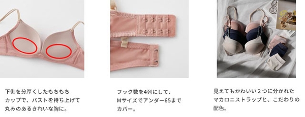 本商品は、もちもちの低反発カップが個人差やバストの左右差に応じて沈みこむことで、どんな胸にも合いやすい、気持ちいいフィット感のワイヤレスブラジャーです。アンダーバストのサイド部分=ミミまで低反発素材にしてバストの周りをやさしく包み込む【ふわ胸】と、下側を分厚くしたカップでバストを持ち上げてキレイな胸を形作る【まる胸】の2グループをラインアップ。【ふわ胸】は、前中心のチャームがワンポイントの上品でかわいらしい印象に、【まる胸】は見えても可愛い2つに分かれたマカロニストラップと、こだわりの配色でカジュアルな印象に仕上げました。いずれも、フックの数を4列にすることでMサイズでアンダー65までカバーします。ストレッチ性のある素材ではき心地にもこだわったペアショーツとともに、もちもちの新触感をぜひ体感してみてください。