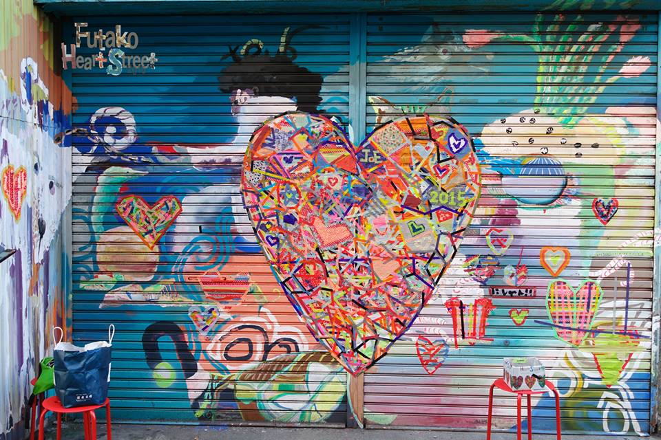 心と心をつなぐプロジェクト「フタコハートストリート」とは、二子玉川の商店街をハートで埋め尽くし、心と心をつなぐ参加型のアートプロジェクトです。このプロジェクトの期間中、二子玉川の街や商店街にはマスキングテープを切り貼りして制作したハートアートがあふれます。