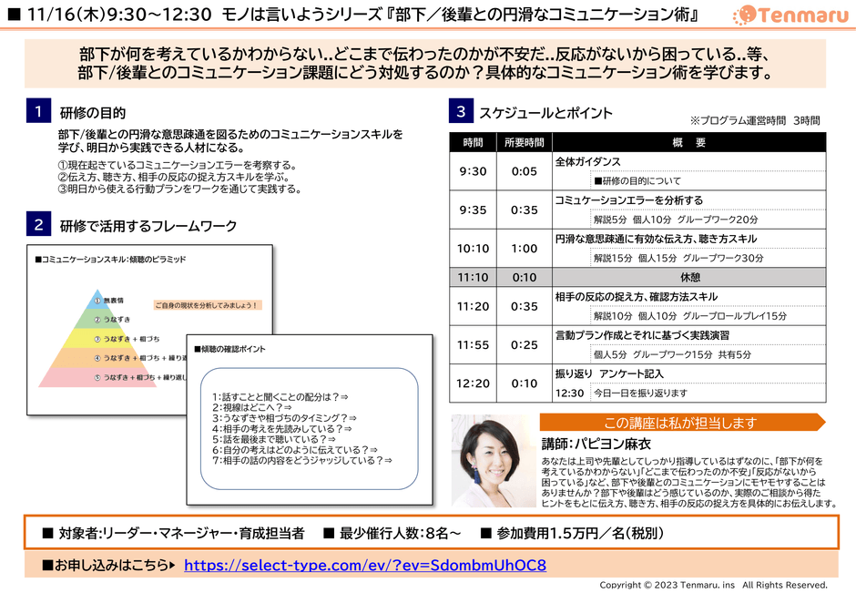 組織づくりや人材教育・キャリア開発、人材採用支援を行う株式会社Tenmaru(本社:東京都港区、代表取締役:諸戸 歩)は、2023年11月、マネジメントを行う方を対象とした部下・後輩とのコミュニケーションに関する講座を行います。組織の成果をあげるために双方の思い・考えを伝え合うコツを学びます。