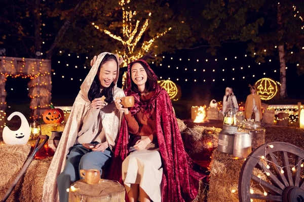 ハロウィン牧場ラウンジには、焚火や牧草のソファ、ジャックオーランタンが描かれた牧草ロールのイルミネーションなどがあります。広大なファームエリアだからできる牧歌的で温かい雰囲気のパーティー会場です。ここでは、当リゾートにて放牧している牛から搾乳した「トマム牛乳」をホットミルクにして提供します。身体を芯から温めるホットミルクを飲みながら、パーティーの最後を締めくくる花火を楽しめます。