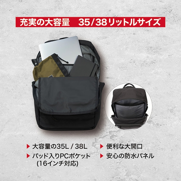 〈COHESIVE 38 – WP〉は通常モデルよりも3L大きく、全面にフルターポリン生地を採用したことで防水性能も向上。