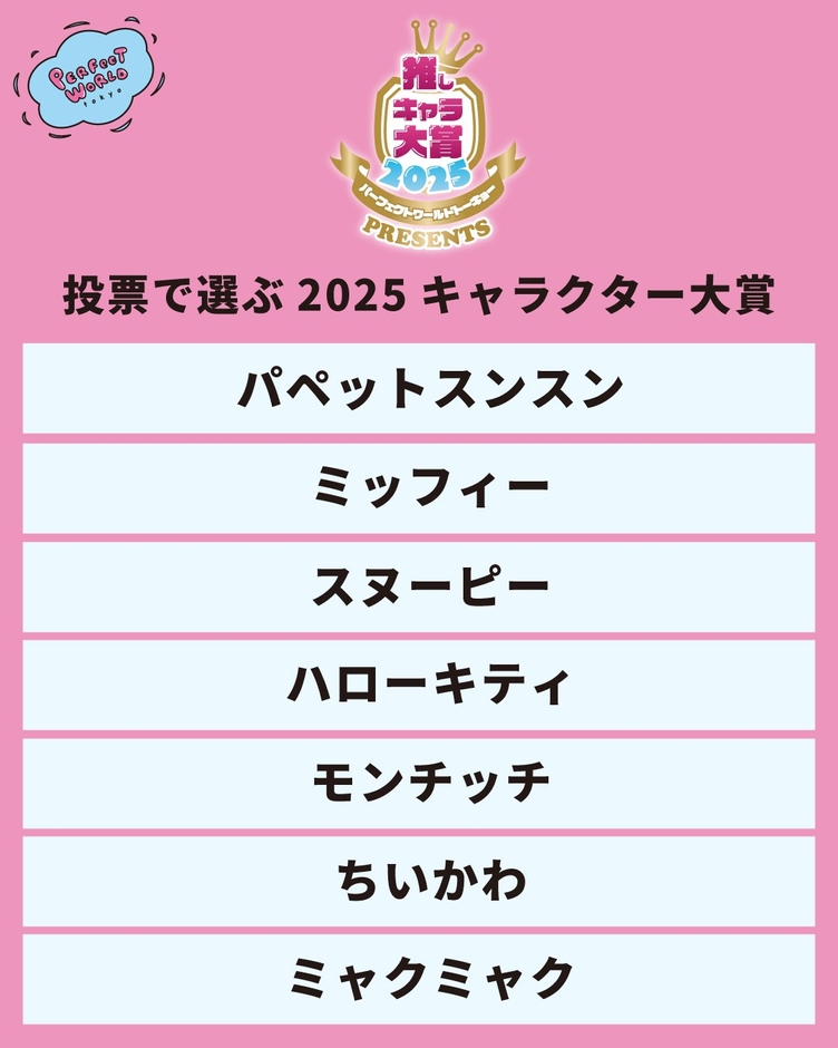パーフェクトワールド(株)では、「パーフェクトワールドトーキョー」をご愛顧いただいている皆さま、当社メディア・SNSをご覧の皆さま、そしてキャラクター商品の企画・製造・販売に携わるメーカー各社の声をもとに、“2025年を象徴するキャラクター”を決定する企画