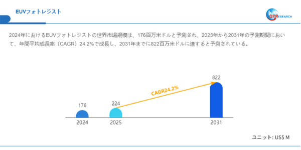QYResearchが発表した新たな市場調査レポート「EUVフォトレジスト―グローバル市場シェアとランキング、全体の売上と需要予測、2026~2032」によると、世界のEUVフォトレジスト市場規模は2024年の約176百万米ドルから2025年の224百万米ドルへと順調に拡大すると見込まれ、予測期間中は年平均成長率(CAGR)24.2%で成長し、2031年には822百万米ドルに達すると予測されている。