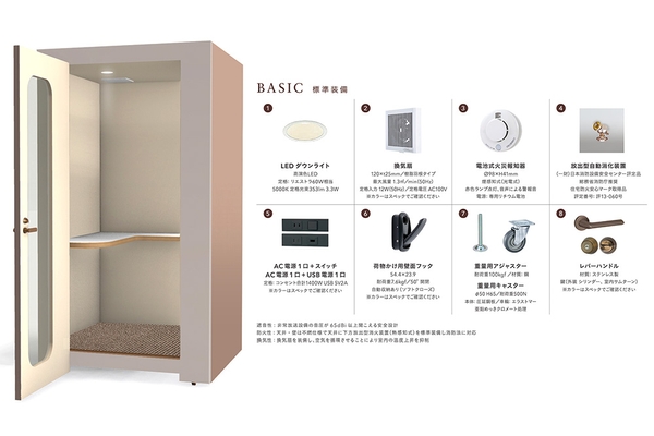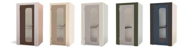 インテリア性を意識したデザインと、様々な空間になじむように5色のカラーバリエーションからお好みに合わせてセレクト可能です。照明、コンセント、換気扇等が標準装備され、静かな環境の中でストレスなくオンライン会議やパソコンを使用した個別作業が行えます。