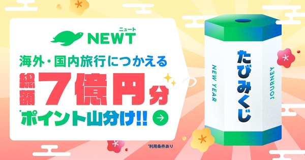 株式会社令和トラベル(本社:東京都渋谷区、代表取締役:篠塚 孝哉)が運営する、かしこい、おトク、旅行アプリ『NEWT(ニュート)』は、2025年12月26日 (金) 12:00より、「メガ初売りセール」を実施中です。 さらに、2026年1月3日 (土) 12:00からは、2026年最初のキャンペーンとして、国内・海外旅行にご利用いただける総額7億円分のポイントを山分けする「たびみくじ」を開始いたします。期間中にいつでも利用可能なツアー・ホテルが15%オフになるクーポンに加え、「毎週土曜日はNEWTの日」と題し、海外ツアーが最大50%オフとなる限定クーポンなど、順次発行予定です。新年最初の旅のご予約は、NEWTのおトクなキャンペーン期間をぜひご活用ください。
