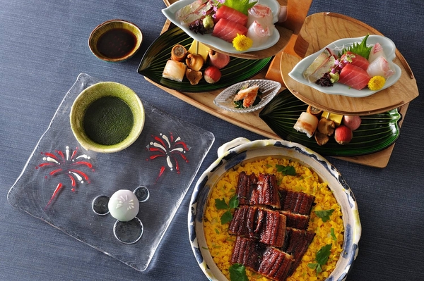 船を彷彿とさせる盛り付けの八寸やお造り、船や波がカラフルに描かれた土鍋など、見た目も楽しい夕食の最後に、花火をモチーフとした和菓子が登場します。伊東の海の上でキラキラと弾ける花火をイメージした和菓子です。旬の食材や海の幸を中心とする会席料理に「花火」が加わることで、より一層、夏を感じられます。