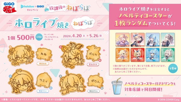 GiGOのたい焼きにて、ホロライブとのコラボたい焼き 「ホロライブ焼き~ねぽらぼ~」を販売いたします。1個お求めの方に、オリジナルコースター(全8種/ランダム)を1つを進呈いたします。