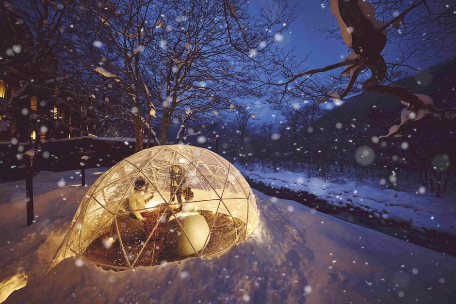 夕食は、渓流の瀬音や旬の食材を駆使したフランス料理、偉大な造り手による銘醸ワインが味わえるフレンチレストラン「Sonore」にて、冬限定ディナーコースを提供します。食事は当プラン限定の、雪に覆われた屋外テラスで楽しむ「雪見アペリティフ」から始まります。暖かいドームの中からしんしんと舞う雪や渓流を眺め、せせらぎを聞きながらのアペリティフはここならではの体験です。