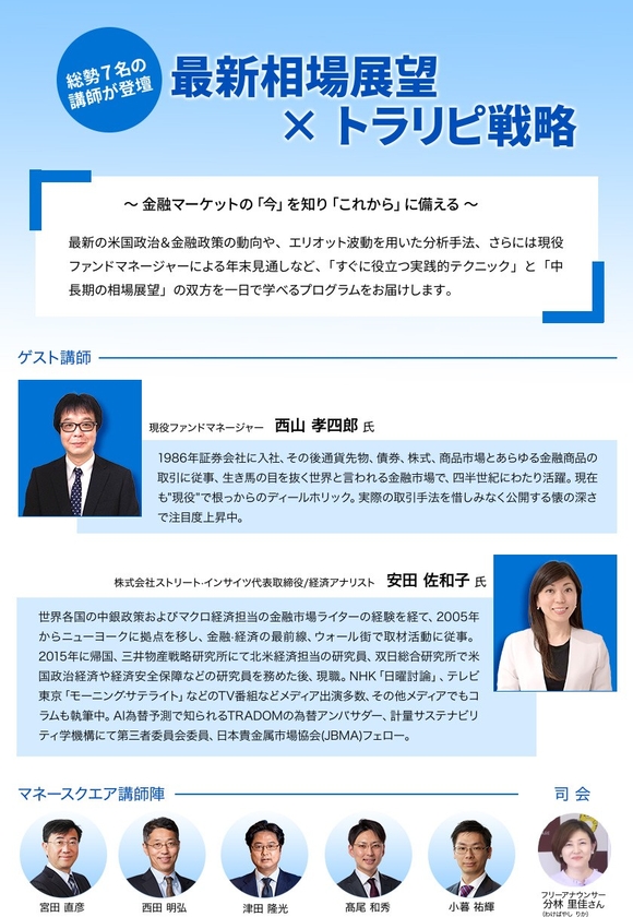 最新の米国政治や金融政策の動向、エリオットは同を用いた分析手法、さらには現役ファンドマネージャー西山 孝四郎氏による年末見通し等、「すぐに役立つ実践的テクニック」と「中長期の相場展望」の双方を一日で学べるプログラムをお届けします。