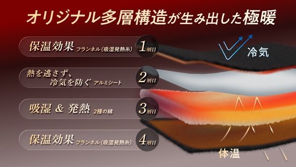 GOKUMINは独自の多層構造により、羽毛布団に匹敵する暖かさを実現しました。高密度フランネル、断熱アルミシート、吸湿発熱中綿を重ねることで外気を遮断し、体温をしっかりキープ。さらに、吸湿発熱素材が寝汗や湿気を吸収し、熱に変換するため、一晩中快適な温度を保ちます。布団に入った瞬間から「ほっ」と安らぎ、朝まで心地よい温かさが続く“極暖体験”をお届けします。