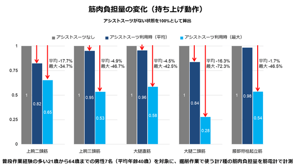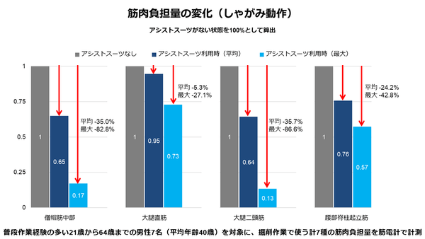 本製品の着用により、対象の筋肉における筋肉負担量が未着用時と比較して最大3~8割軽減する結果が得られました。また、暑熱対策のため、通気性を高め、背中には保冷剤を挿入するスペースを設けました。