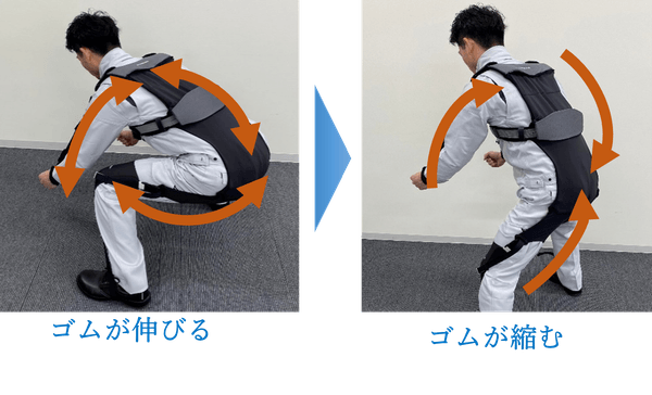 着用手順は、胸まわりと足まわり、腕まわりのベルトを締めるだけです。約1kgと非常に軽量なため着用の負担が少なく、背中、腰、脚、腕をアシストします。作業者が腰を落とした中腰姿勢をとり、土砂をすくおうとすると人工筋肉とゴム部分が伸長し、土砂をすくい上げる際に伸長した部分が収縮することでアシスト力を発揮し、作業負担を軽減します。また、本製品を着用することで不良姿勢を取りづらくなるため、中腰姿勢の荷物の持ち上げや持ち運び等の運搬作業の負担も軽減します。