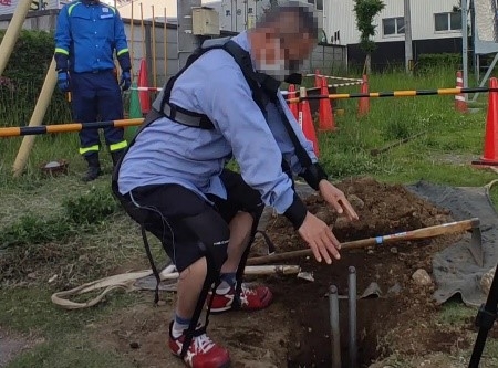 主要な通信設備である電柱を建てるためには、約1.2~1.5mほどの深さの筒状の穴を掘削する必要があります。一般的にこの作業は、ガス管や水道管などの埋設物の損傷を防ぐため、手作業による掘削作業を行います。こうした作業は1箇所あたり最大2時間の作業時間が必要であり、作業者の身体的負担が大きいという課題がありました。そこで掘削作業動作の負担軽減を目的として、当社が2020年より提供している、人工筋肉を使ったアシストスーツ「DARWING Hakobelude(ダーウィン ハコベルデ)」をベースに、両足部分のサポート機能を加えた「DARWING Hakobelude Leggers MODEL」と、両腕部分をサポートする「TRA+」を新たに開発しました。