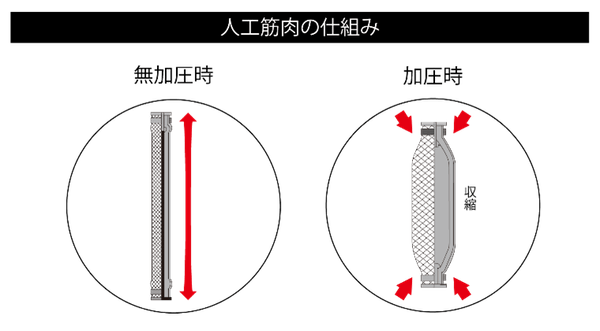 ・背面に配置された高反発ゴムと空気圧式の人工筋肉が動作をサポート