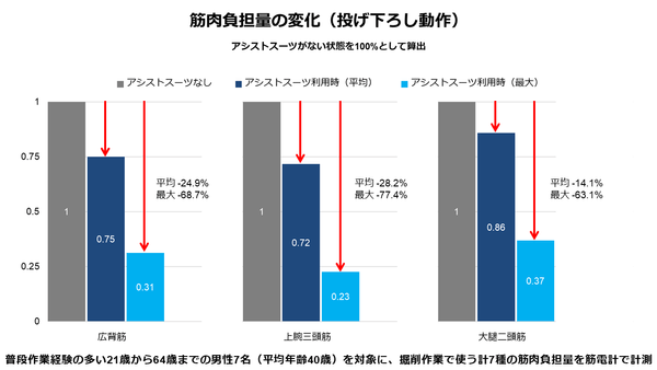 掘削作業で行う主な3つの動作における筋肉負担量を筋電計で計測しました。