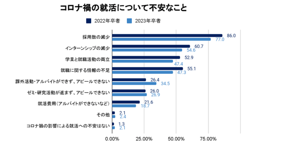 2023年卒の学生は2022年卒学生ほど企業の採用活動(採用数・インターンシップの数・情報量など)に対して、不安を抱いてない様子が伺えます。しかし「課外活動・アルバイトができずアピールできない」の項目においては、2022年卒(26.4.%)、2023年卒(34.5%)と8.1ポイント高くなっています。その要因として、2023年卒の学生は大学入学後約1年でコロナの影響を受けたため、22卒と比較して課外活動ができない状況下にあったことが推察できます。