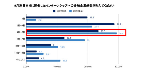 2022卒と2023年卒を比較すると、参加企業数が「1社」と回答した学生の割合において、2022年卒は19.9%、2023年卒は3.2%でした。また、2022年卒のボリュームゾーンが「2~3社」(28.7%)、2023卒は「4~5社」(29.4%)という結果からも、就職活動量に関しては増加していることが分かりました。新型コロナウイルスの影響からオンラインでインターンシップを開催する企業が増加しているため、学生側は移動時間を考慮する必要がなく、インターンシップへの参加障壁が低くなり、一人あたりのインターンシップ参加企業数も増加している傾向にあることが考えられます。
